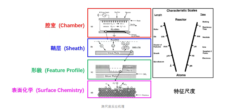 跨尺度建模难题:等离子体放电在米级腔室尺度进行,而刻蚀形貌演化在纳米尺度发生,二者跨越高达8个甚至更多数量级的空间尺度,在同一仿真模型中采用不同物理模型,实现从宏观放电到微观形貌的全流程仿真极为困难。