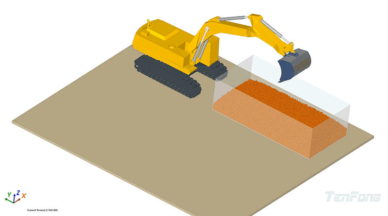 工程机械行业提高生产效率与设备可靠性。在建筑设备、水轮机发电等机械工程场景中,颗粒堆积、流动不均与设备磨损是常见问题。传统经验难以预测复杂颗粒行为,设计优化往往依赖试错。TF-DEM提供多种磨损预测模型,具备丰富的计算监控功能,可监控物料入料情况、边界受力变化、域局部体积平均物理量,并可以与多体动力学仿真软件耦合模拟复杂机械运动。使用TF-DEM能够模拟机械设备中的大规模颗粒流动、堆积和冲击过程。工程师可以提前评估设备的运行效率和潜在故障点,指导工艺改进和设备优化,实现生产效率和可靠性的提升。