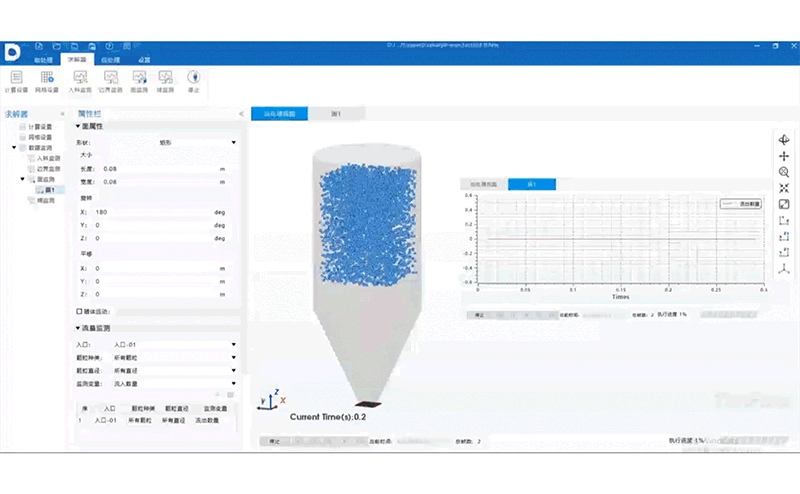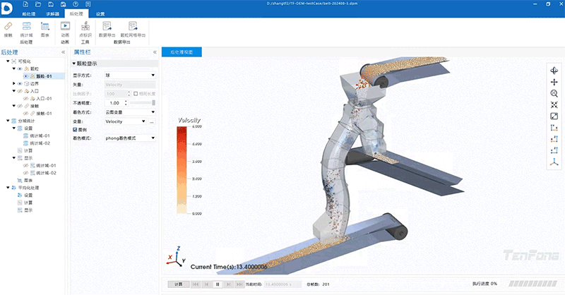 直观的图形交互操作和显示功能,让仿真工具更美观易用。TF-DEM的一体化界面将建模、求解、后处理融为一体。软件具备丰富的计算监控功能,可监控物料入料情况、边界受力变化、面流量波动、域局部体积平均物理量,并支持分域统计和平均化处理,协助用户全面分析仿真过程中的关键参数和变化趋势。用户可直接观察颗粒运动轨迹、力链分布、速度场与接触应力变化,并以动画形式重现整个工艺过程。