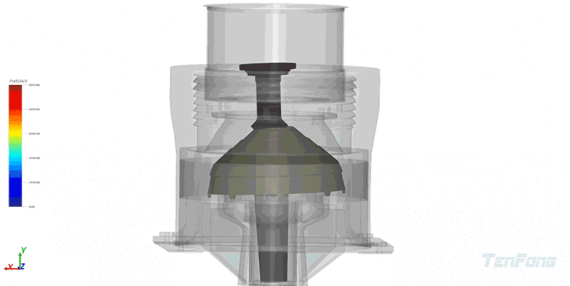 矿冶行业提升物料破碎与输送效率。在矿山开采与选矿流程中,物料破碎与输送一直是高能耗环节。颗粒在破碎机或输送管道中的运动复杂,难以通过传统实验直观观测。TF-DEM支持非球形颗粒建模与多分散颗粒物性,支持采用颗粒固结模型模拟块体破碎,并提供多种复杂运动边界条件,可模拟皮带输运、边界振动等物理过程。通过TF-DEM仿真,工程师能够精确模拟矿石颗粒的运动路径与受力分布,评估输运效率,并在设计阶段优化入料参数与输送系统布局,实现降低能耗、延长设备寿命的目标。
